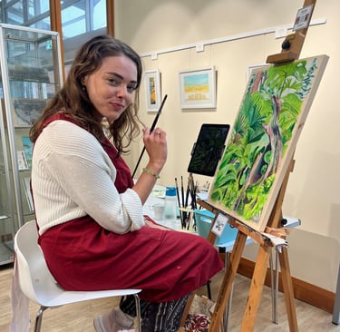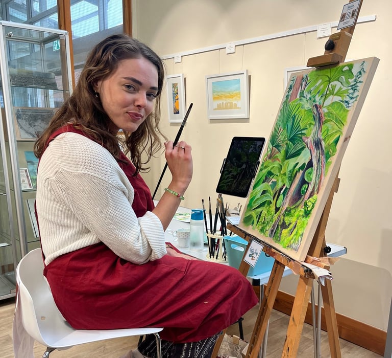 Katie in action as she paints at a live painting exhibition in Taunton Library, 2024.